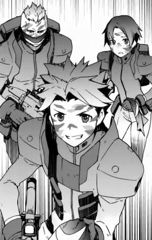 Heivia and the others were traveling beneath the vehicles. That was an alternate way through the maintenance base zone which was made up of over one hundred vehicles. The vehicles left a space of over two meters above the ground, so they could remain standing as they ran and they could hide behind the giant wheels.
