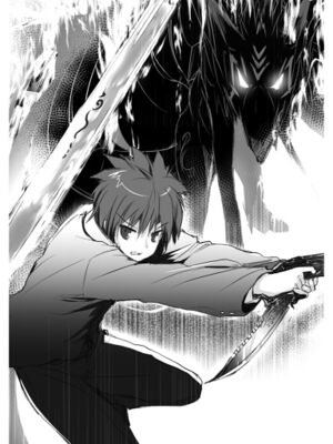 Naturally, the muzzle was aimed at True Genbu-Ou. Activating assured annihilation, the magic gun fired in full auto. All twenty-odd bullets remaining in Hal's magic gun flew at the winged black serpent in the form of red flashes of light, repeatedly chipping away at the long and stout serpentine body.