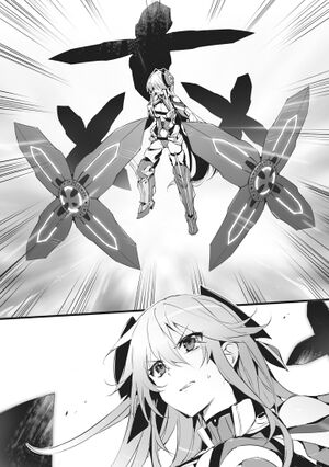Aldea undid the restraints on Himekawa’s body as if throwing her away. The six shields once more attached themselves to her body, she ignited her thruster and headed towards the direction from where the Pulverizer came with full speed.