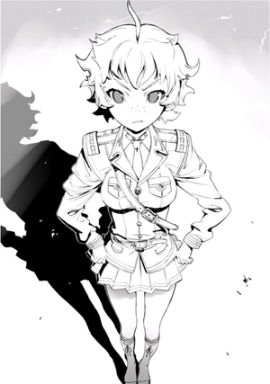 She spoke while flipping her beautiful blonde hair. ...Burnt brown lower garments and a white shirt, and a Warrant Officer rank insignia. No matter how she looked, it was the same outfit as Ikta's, one for High Grade Military Officer Cadets, but the size of everything was extremely small. When he looked at the person herself, she was of an age where she might have been attending a Middle Grade Academy.